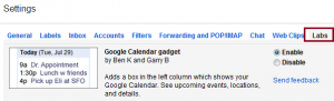 A great way to keep an eye on your calendar while in your gmail account is to add it into your sidebar. This is very helpful when responding back to profs or fellow students on good times to meet-up. Having your calendar visible lets you see what days/times are booked.