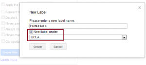 The process to auto-filter email into a nested label is the same process as above except, when creating a new label folder, check Nest label under and select your school folder. Then click on Create.